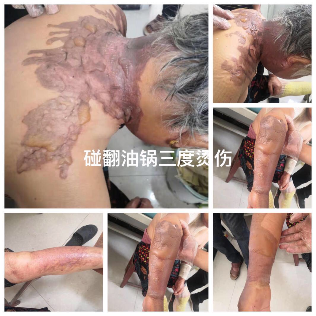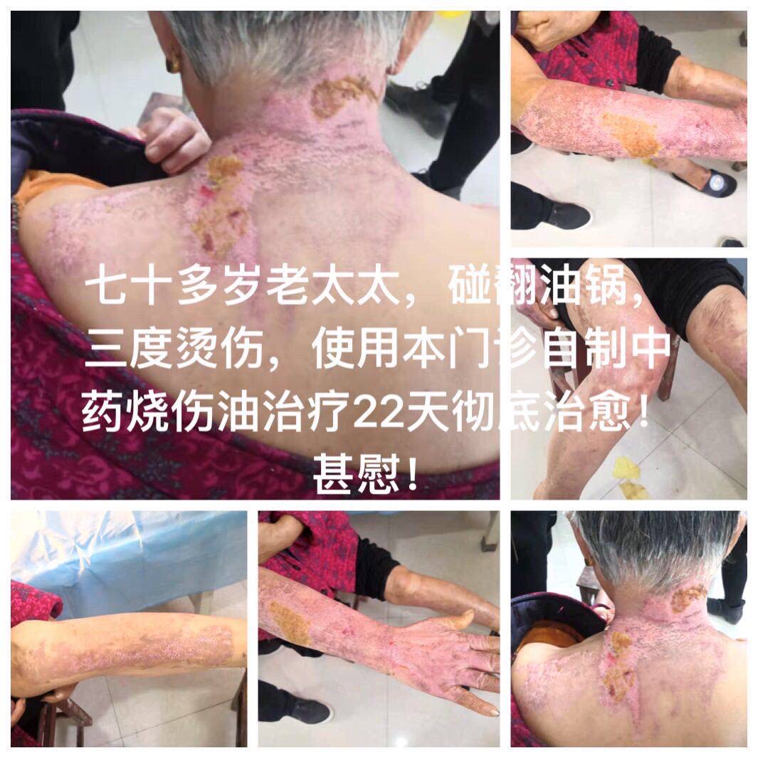 使用自制中药烧伤3号包扎,全程没用任何止痛药物,没使用其他药物创面消毒,每次换药分泌物随敷料脱落,创面干净,免去了创面清洗消毒对创面的刺激和疼痛。全程换药无痛苦,预防性使用抗菌素七天,每天来门诊换药一次,经过22天的换药治疗,患者康复,甚慰!