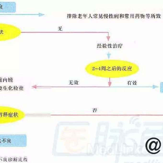 老年人是FD的高发人群,也是OD的高发人群,FD主要应与OD鉴别。常用于消化不良鉴别诊断的检查包括胃镜,上腹部的超声、CT、MR检查,血液生化及消化系统肿瘤标志物检测,食道动力和食管pH监测,胃电图、胃排空和胃容纳功能及感知功能检查等。导致OD的疾病有胃食管反流、食管癌、消化性溃疡、慢性活动性胃炎、胃癌、十二指肠肿瘤、慢性胆囊炎、胆石症、胆道恶性肿瘤、慢性胰腺炎、胰腺癌等;FD与肠易激综合征、慢性便秘及精神障碍性疾病常有重叠,应注意鉴别;老年人还需排除慢性心功能不全、肺心病、帕金森病、脑供血不足等易致消化不良的老年人常见慢性病及服用非甾体抗炎药、抗菌药物、抗帕金森病药和降糖药等药物所致的消化不良症状。
