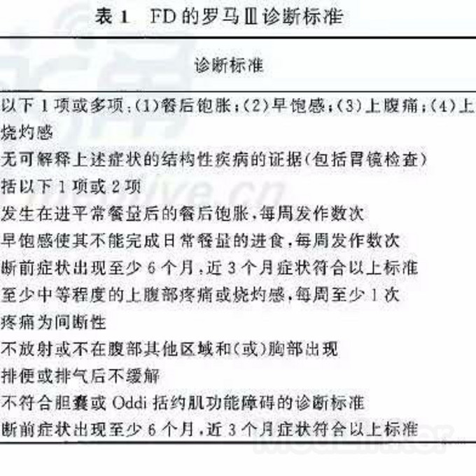FD患者临床表现的个体差异性大。根据主要症状特点、与症状相关的病理生理学机制以及症状模式,可将FD分为两个亚型,即餐后不适综合征(postprandial distress syndrome,PDS)和上腹痛综合征(epigastric pain syndrome,EPS),见表1。临床上两个亚型常有重叠,有时可能难以区分,但分型对选择治疗将有一定帮助。在以研究为目的时应进行较严格的亚型分类。老年人FD的诊断参考FD的罗马III诊断标准。
