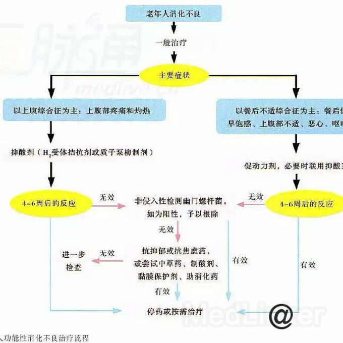 老年人是FD的高发人群,也是OD的高发人群,FD主要应与OD鉴别。常用于消化不良鉴别诊断的检查包括胃镜,上腹部的超声、CT、MR检查,血液生化及消化系统肿瘤标志物检测,食道动力和食管pH监测,胃电图、胃排空和胃容纳功能及感知功能检查等。导致OD的疾病有胃食管反流、食管癌、消化性溃疡、慢性活动性胃炎、胃癌、十二指肠肿瘤、慢性胆囊炎、胆石症、胆道恶性肿瘤、慢性胰腺炎、胰腺癌等;FD与肠易激综合征、慢性便秘及精神障碍性疾病常有重叠,应注意鉴别;老年人还需排除慢性心功能不全、肺心病、帕金森病、脑供血不足等易致消化不良的老年人常见慢性病及服用非甾体抗炎药、抗菌药物、抗帕金森病药和降糖药等药物所致的消化不良症状。