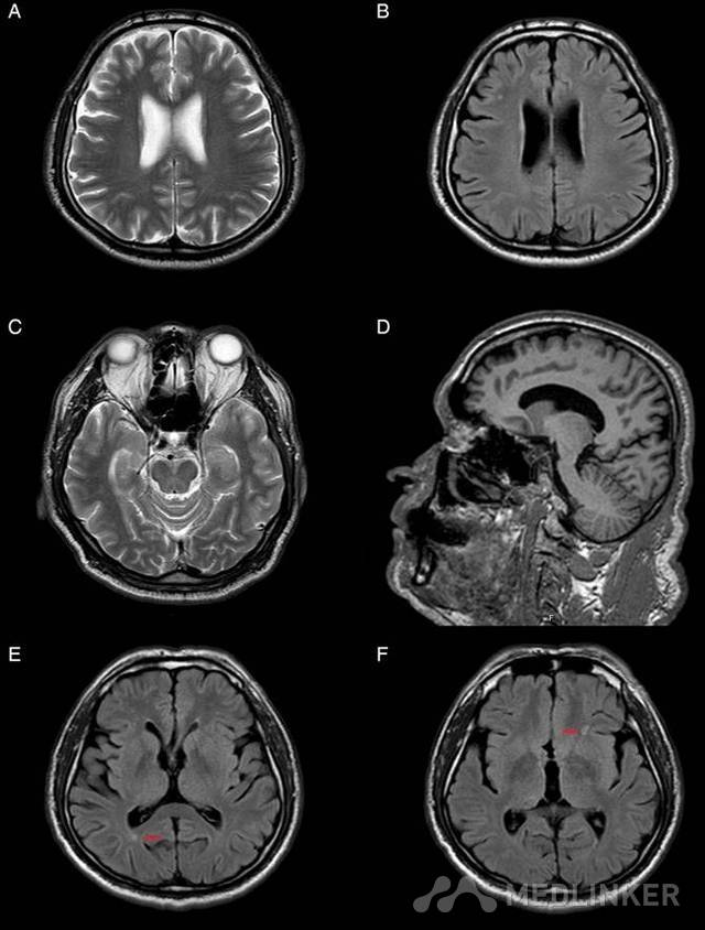图1.(A,B 和 D)脑 MRI 显示双侧额叶萎缩。(C)颞叶是正常的。(E、F)部分额叶和枕叶胶质增生(红色箭头)。