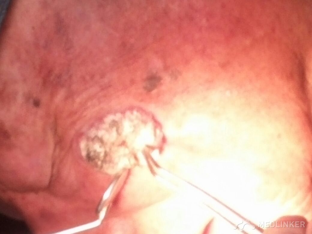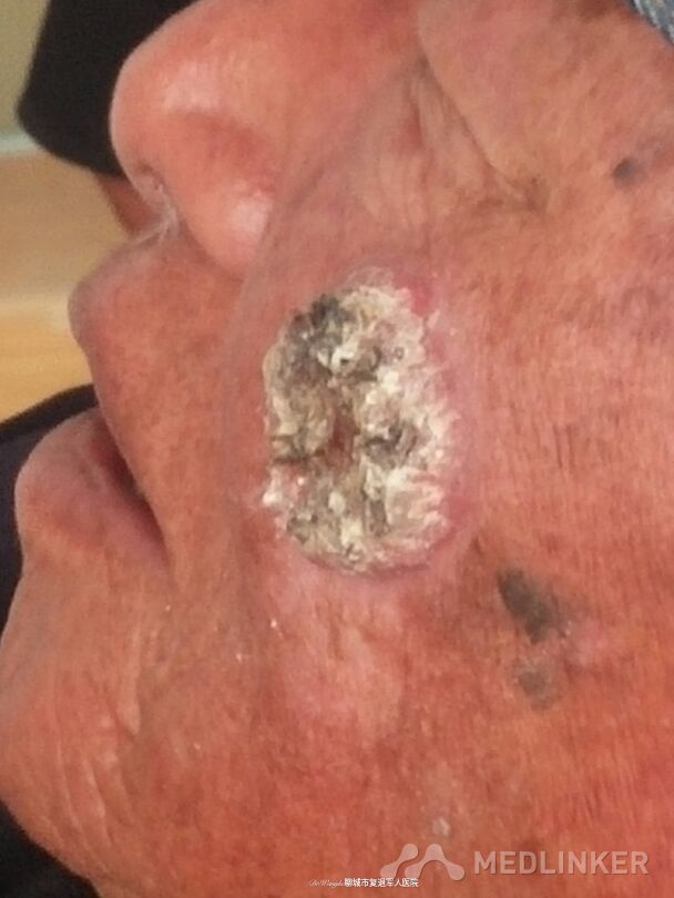 患者于20年前曾因阴茎部菜花样肿物(病理为鳞癌)行手术治疗,术后未见异常,2年前左侧颧面部出现直径约1cm疣状物,于当地行外敷膏药(具体种类不详)治疗,效果不佳,肿物缓慢生长,近半年肿物生长迅速,直径已达3cm。患者家属述肿物最长时可突出3cm,曾绒毛状(现已脱落)。患者一般情况可,无严重系统性疾病,请问各位老师这种情况怎样处理最合理?