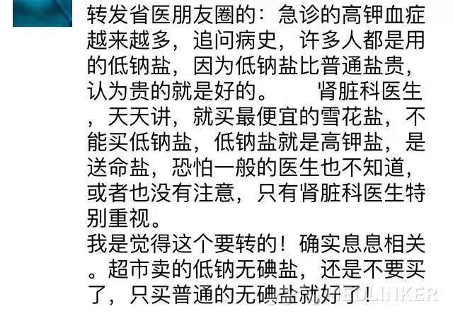 原帖内容如下:“急诊的高钾血症越来越多,追问病史,许多人都有食用低钠盐的经历,因为低钠盐比普通盐贵,很多人认为贵的就是好的。有些肾脏科医生天天讲,就买最便宜的雪花盐,不能买低钠盐,低钠盐就是高钾盐,是送命盐,恐怕一般的医生也不知道,或者也没有注意到,只有肾脏科医生特别重视。我是觉得这个要转的……”