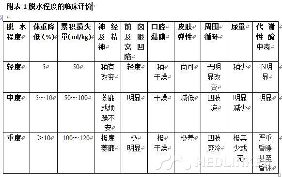 脱水的程度常以丢失液体量占体重的百分比来评估。患儿常有液体丢失的病史及脱水体征,如果病人无近期的体重记录,体重下降的百分比常可通过体检及询问病史估算。一般根据前囟、眼窝的凹陷与否、皮肤弹性、循环情况和尿量等临床表现综合分析判断,常将脱水程度分为三度(见附表1)。