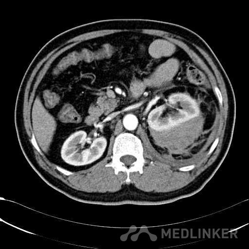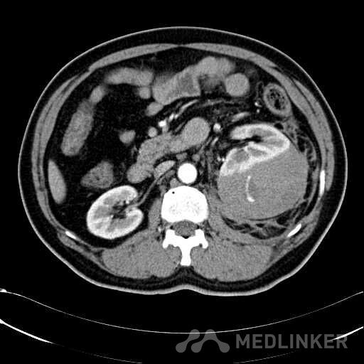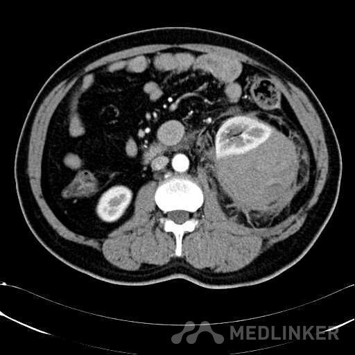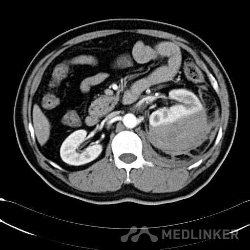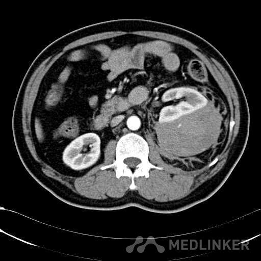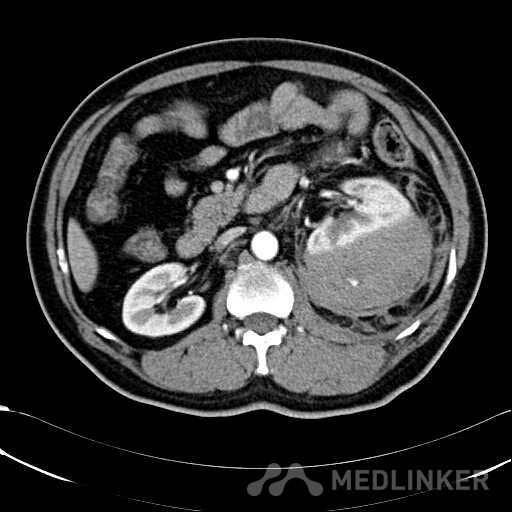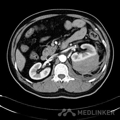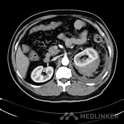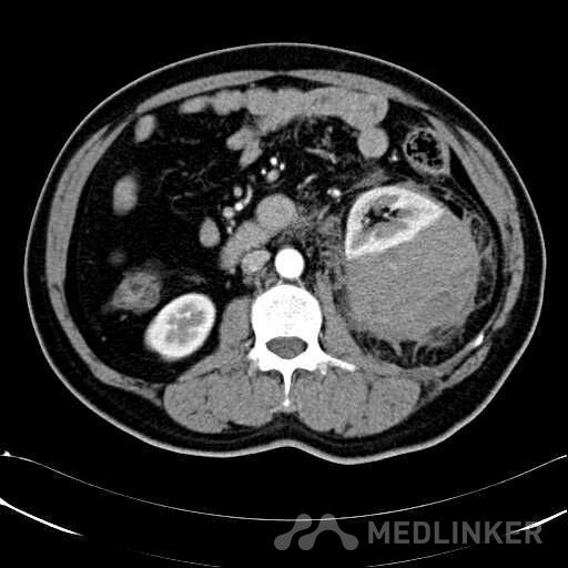 现病史: 缘于入院前3小时患者无明显诱因出现左腰部剧烈疼痛,无向他处放射,与活动及体位无明显关系,伴有腹胀、恶心、呕吐,无头痛、头晕,无人事不省、口吐白沫,无胸闷、胸痛、咯血,无发热、畏冷、寒战,大小便未解,肛门无停止排气,遂就诊我院,查“泌尿系彩超:左肾实质及不均质回声区,范围约9.4*4.1cm,界不清,内未见明显血流信号”,为进一步治疗,门诊拟“左肾占位”收住入院,发病以来,患者精神欠佳,未进食,大小便如前述,体重无明显改变。