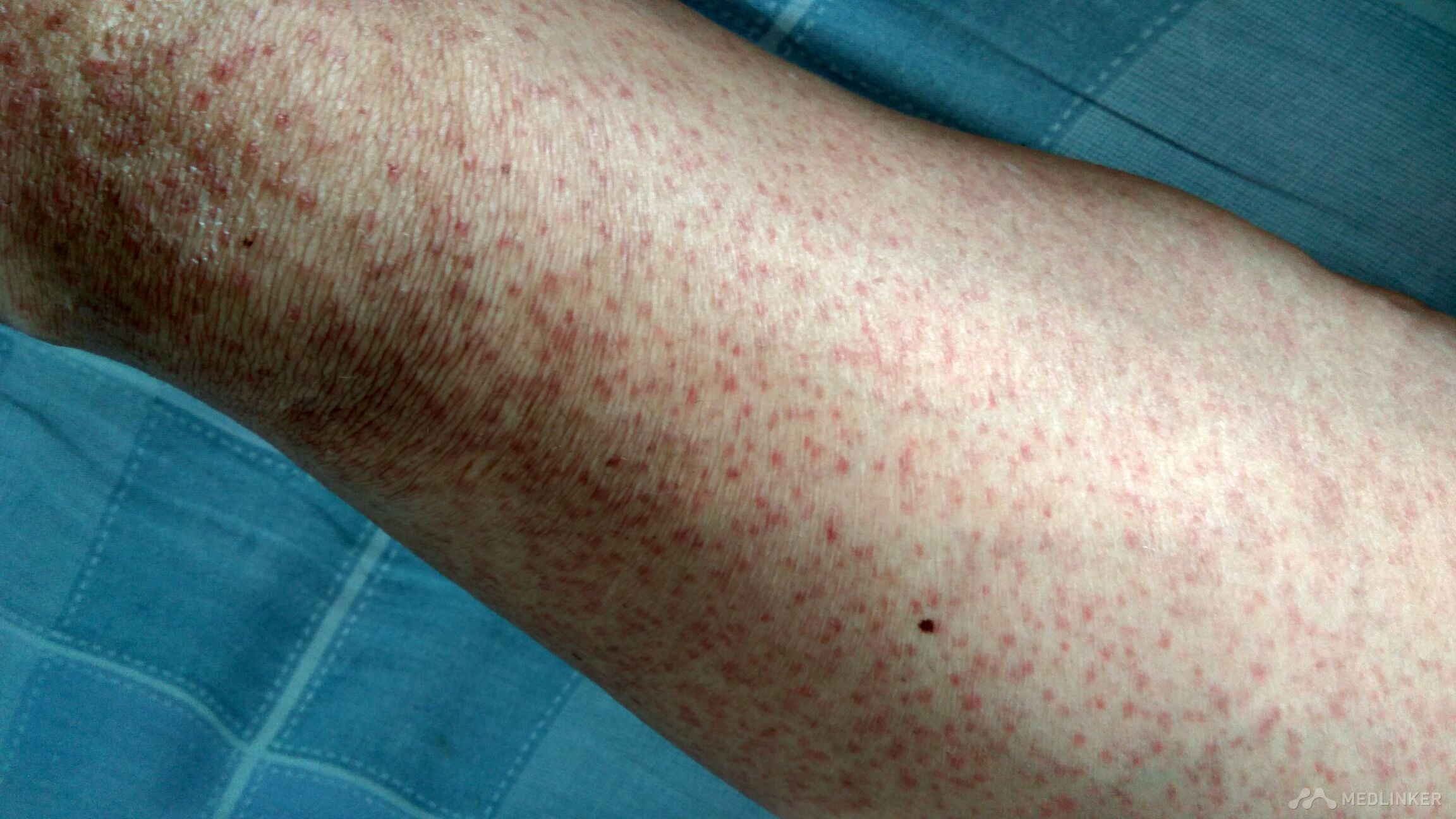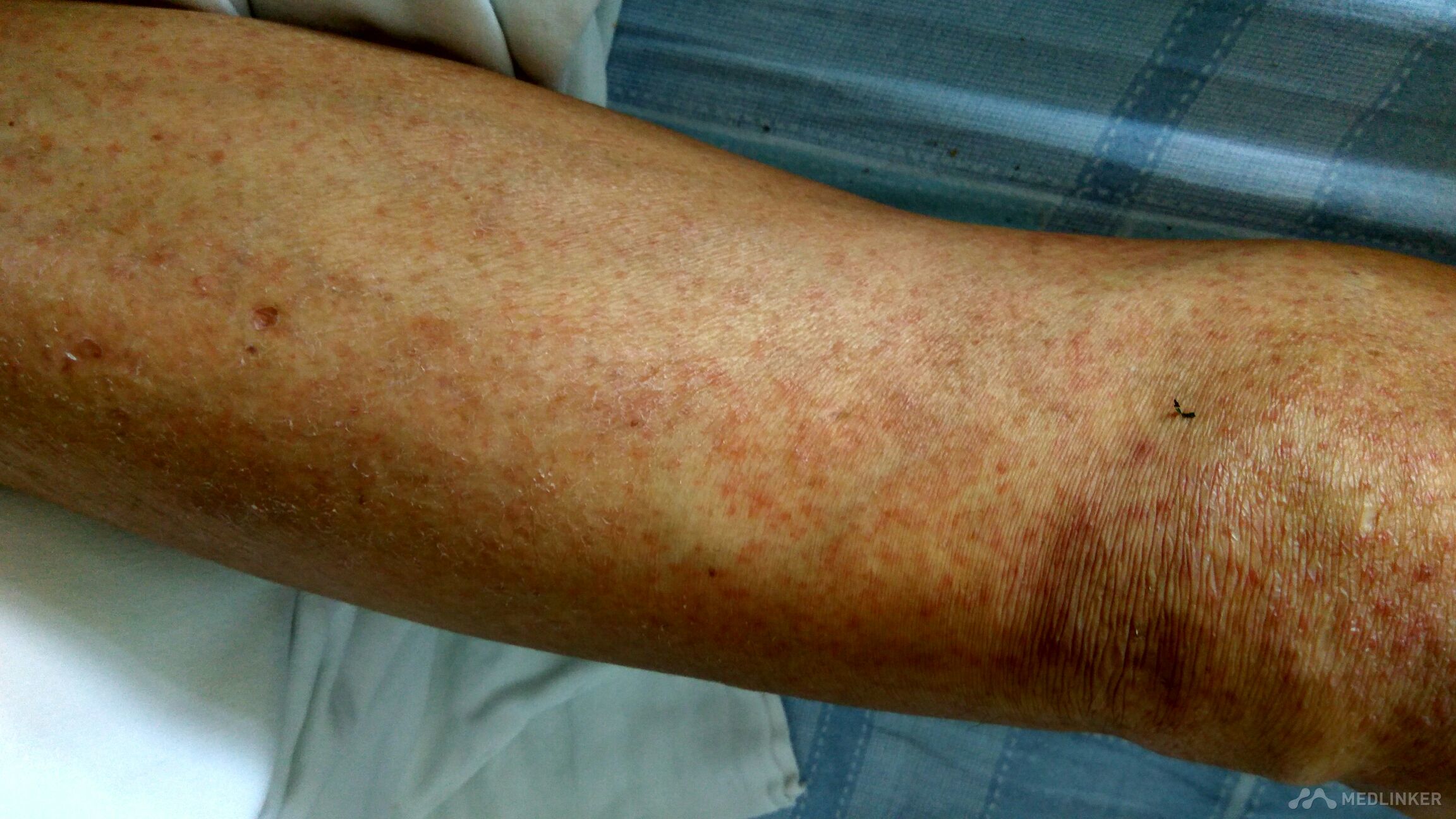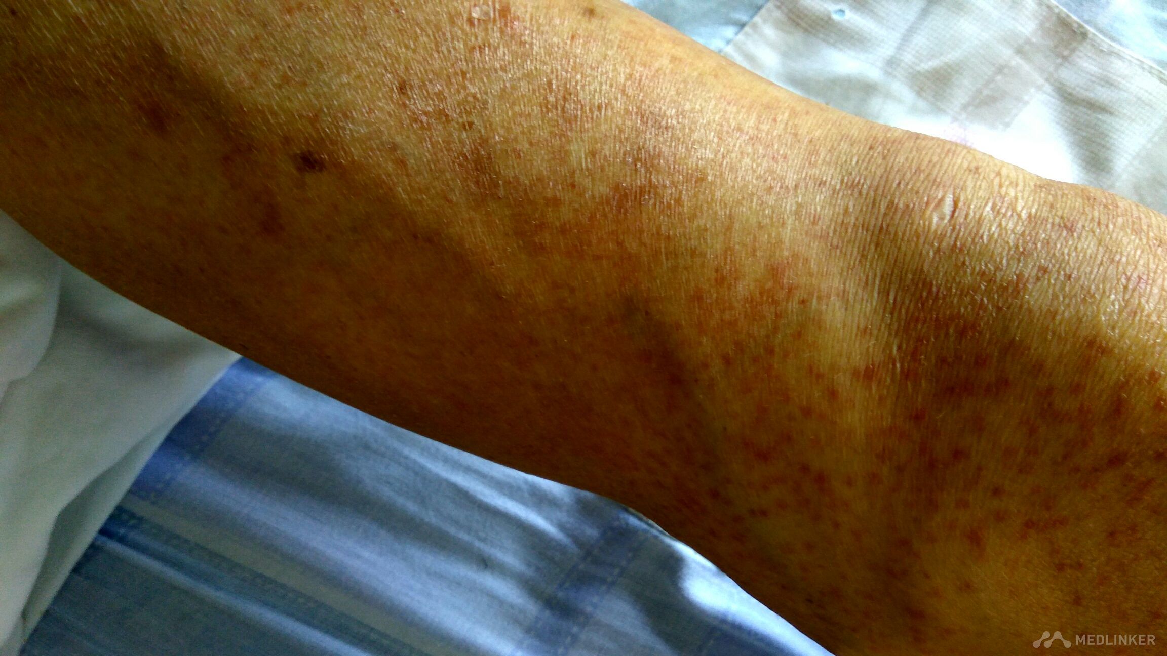 发现淋巴瘤时就一直存在,已经1年多了,压之褪色,双下肢的皮疹最多(如图),且久蹲时颜色加深,平躺无承重时颜色变浅,血小板计数和凝血功能都正常。请问这到底是什么东西?有人说是过敏性紫癜,但是压之褪色;有人说是病毒疹,但这种应该有自限性可一直好不了;有人说是药物疹,到底是什么来着?