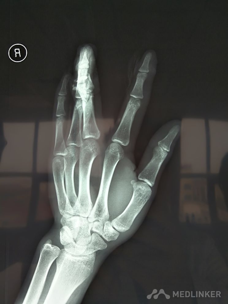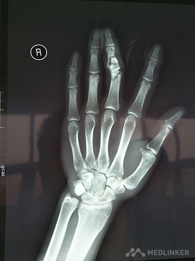 患者机器碰伤,导致中指粉碎性骨折,关节面毁损。