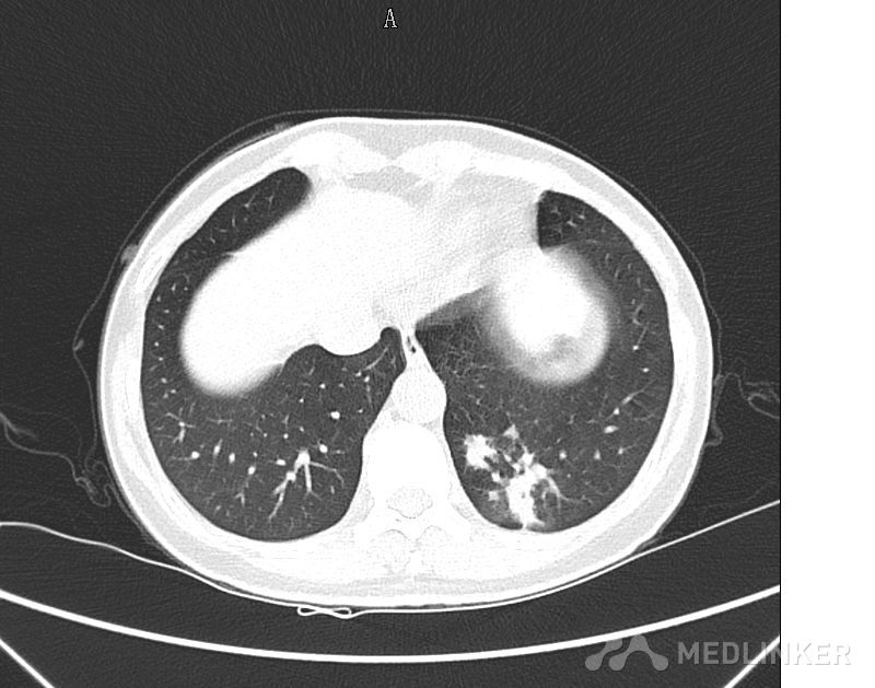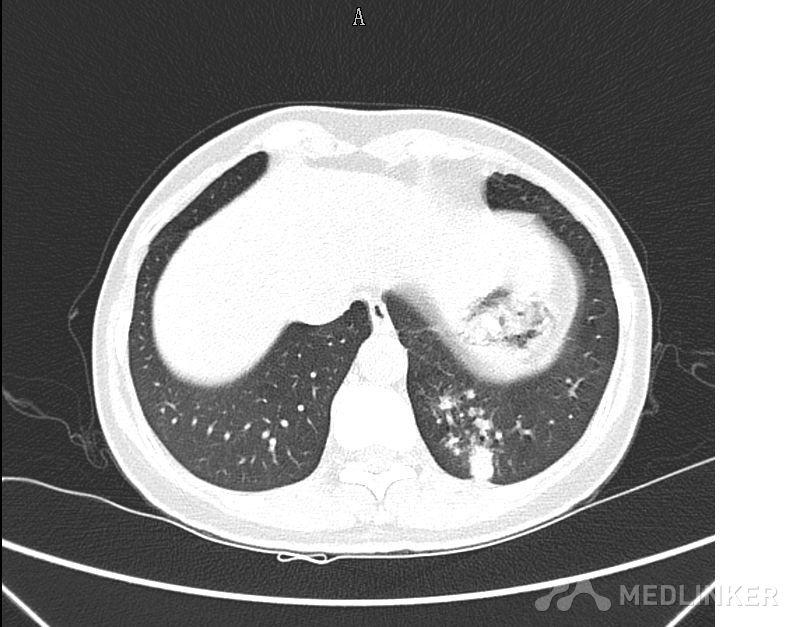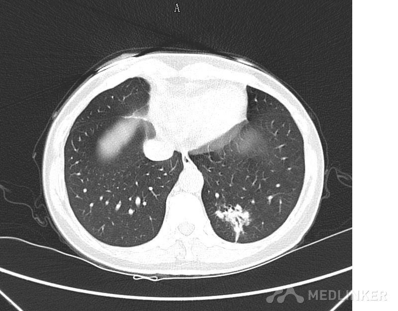 以CT图片为准,中年男性,反复咳嗽半个月入院,有低热,痰不多,无咯血,饮食睡眠正常。