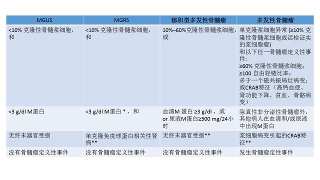 表 1. 不确定意义的单克隆丙种球蛋白病(MGUS), 以肾脏病变为主的单克隆丙种球蛋白病(MGRS), 郁积型多发性骨髓瘤和多发性骨髓瘤的诊断标准