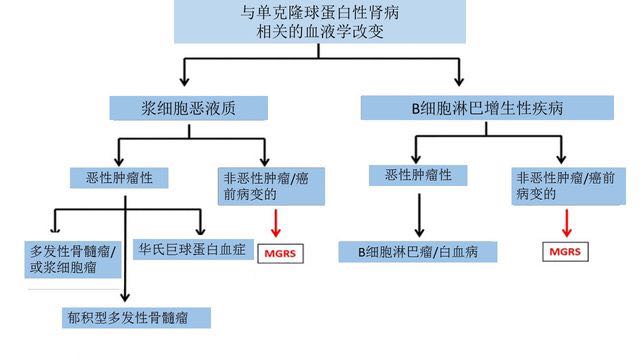 图 1 造成单克隆球蛋白相关性肾病的血液学改变 血液学改变分为浆细胞源性和 B 细胞源性,进一步分为恶性肿瘤性和非恶性肿瘤性/癌前病变性。MGRS:肾病病变为主的单克隆丙种球蛋白病。